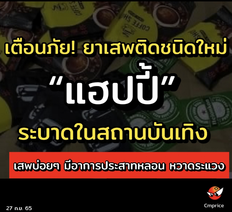 เมื่อวันที่ 26 กันยายน 2565 นางสาวรัชดา ธนาดิเรก รองโฆษกประจำสำนักนายกรัฐมนตรี เตือนภัยยาเสพติดชนิดใหม่ “แฮปปี้" จากรายงานของกรมการแพทย์ สถาบันบำบัดรักษาและฟื้นฟูผู้ติดยาเสพติดแห่งชาติบรมราชชนนี พบว่า ปัจจุบันในพื้นที่ จ.ท่าขี้เหล็ก ประเทศเมียนมาตรงข้ามกับ อ.แม่สาย จ.เชียงราย พบการจำหน่ายยาเสพติดชนิดใหม่ และพบมีการลักลอบจำหน่ายในสถานบันเทิงของประเทศไทย โดยการนำตัวยาเสพติดมาบรรจุในถุงพลาสติกทรงสี่เหลี่ยมผืนผ้าขนาดเล็ก และติดรูปภาพหรือตราสัญลักษณ์ของผลิตภัณฑ์ต่าง ๆ บางซองมีลักษณะคล้ายถุงยางอนามัยและหากไม่สังเกตจะแยกไม่ออก แต่ภายในซองจะบรรจุผงสีขาวขุ่น น้ำหนักประมาณ 15-20 กรัม เป็นยาเสพติดที่มีส่วนผสมของสาร Benzylpiperazine (BPZ) มีฤทธิ์คล้ายยาบ้าแต่มีความรุนแรงน้อยกว่า 1 ใน 10 ของยาบ้าออกฤทธิ์กระตุ้นประสาท สามารถทำให้มีอาการหลอน หวาดระแวง ยิ่งการเสพร่วมกับเครื่องดื่มแอลกอฮอล์ หรือสูบควัน อาจมีฤทธิ์เสริมให้เกิดการกระทำที่ขาดสติจนอาจเกิดอันตรายถึงแก่ชีวิตได้