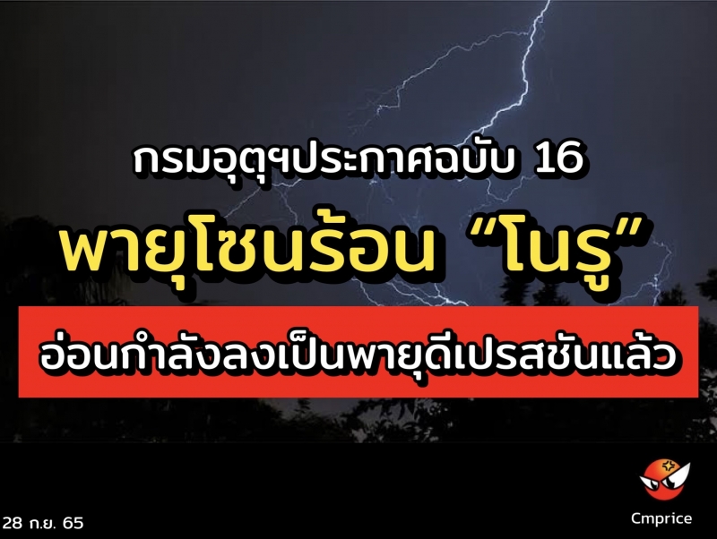 วันที่ 28 ก.ย.2565 เมื่อเวลา 20.30 น. กรมอุตุนิยมวิทยา ออกประกาศเตือน "พายุโนรู" ฉบับที่ 16 ระบุว่า เมื่อเวลา18.00 น. ของวันนี้ (28 ก.ย. 65) พายุโซนร้อน “โนรู” ได้อ่อนกำลังลงเป็นพายุดีเปรสชันแล้ว บริเวณอำเภอโขงเจียมจังหวัดอุบลราชธานี และเมื่อเวลา 19.00 น. มีศูนย์กลางอยู่บริเวณอำเภอศรีเมืองใหม่ จังหวัดอุบลราชธานี หรือที่ละติจูด 15.7 องศาเหนือ ลองจิจูด 105.2 องศาตะวันออก โดยมีความเร็วลมสูงสุดใกล้ศูนย์กลางประมาณ 55 กิโลเมตรต่อชั่วโมง พายุนี้กำลังเคลื่อนตัวทางทิศตะวันตกค่อนทางเหนือเล็กน้อย ด้วยความเร็วประมาณ 15 กิโลเมตรต่อชั่วโมง คาดว่าจะอ่อนกำลังลงเป็นหย่อมความกดอากาศต่ำกำลังแรงตามลำดับในระยะต่อไป ประกอบกับมรสุมตะวันตกเฉียงใต้ที่พัดปกคลุมทะเลอันดามัน ภาคใต้ และอ่าวไทยมีกำลังแรง ส่งผลทำให้มีฝนตกหนักหลายพื้นที่และมีฝนตกหนักมากบางแห่งบริเวณภาคเหนือ ภาคตะวันออกเฉียงเหนือ ภาคกลาง รวมทั้งกรุงเทพมหานครและปริมณฑล ภาคตะวันออก และภาคใต้ โดยมีลมแรงในภาคตะวันออกเฉียงเหนือ ขอให้ประชาชนในบริเวณดังกล่าวระวังอันตรายจากฝนตกหนักถึงหนักมากและฝนที่ตกสะสม ซึ่งอาจทำให้เกิดน้ำท่วมฉับพลันและน้ำป่าไหลหลาก โดยเฉพาะพื้นที่ลาดเชิงเขาใกล้ทางน้ำไหลผ่านและพื้นที่ลุ่ม สำหรับประชาชนที่อาศัยบริเวณชายฝั่งให้ระวังอันตรายจากคลื่นที่ซัดเข้าหาฝั่งไว้ด้วย