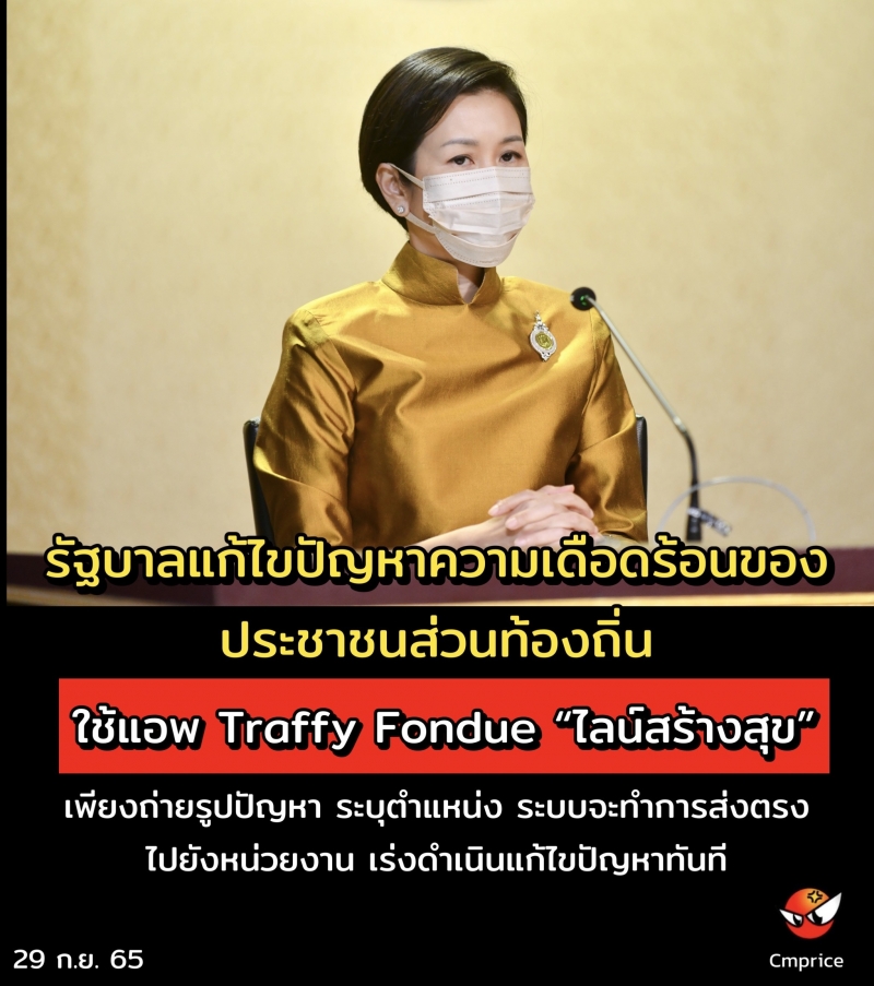 วันที่ 29 กันยายน 2565 นางสาวรัชดา ธนาดิเรก รองโฆษกประจำสำนักนายกรัฐมนตรี เปิดเผยว่า เพื่อเพิ่มประสิทธิภาพในการบริหารจัดการปัญหาของประชาชน รวมถึงรับฟังปัญหาข้อร้องเรียนทุกข์ ตลอดจนข้อเสนอแนะต่าง ๆ รัฐบาลโดย 3 หน่วยงาน ประกอบด้วย สำนักงานปลัดสำนักนายกรัฐมนตรี (สปน.) กรมส่งเสริมการปกครองท้องถิ่น (สถ.) และสำนักงานพัฒนาวิทยาศาสตร์และเทคโนโลยีแห่งชาติ (สวทช.) ได้ลงนามบันทึกความร่วมมือโครงการสนับสนุนการนำเทคโนโลยีสารสนเทศระบบบริหารจัดการปัญหาและข้อร้องเรียน (Traffy Fondue) เพื่อร่วมกันขับเคลื่อนภารกิจการแก้ไขปัญหาความเดือดร้อนของประชาชน ให้ได้ข้อยุติอย่างเป็นธรรมในเวลาที่เหมาะสมโดยยึดความต้องการของประชาชนเป็นที่หลัก