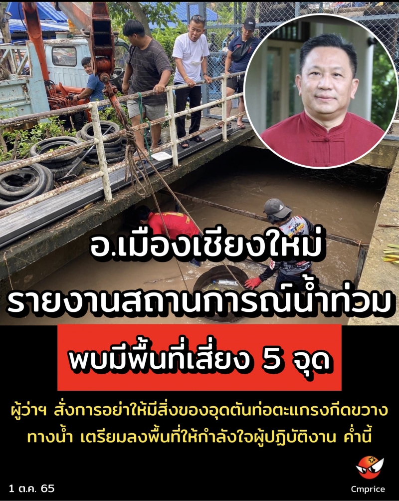 อำเภอเมืองเชียงใหม่ รายงานสถานการณ์น้ำท่วมในพื้นที่จังหวัดเชียงใหม่ วันนี้ (1 ต.ค. 65) ว่ามีพื้นที่เสี่ยง 5 จุดด้วยกัน คือ