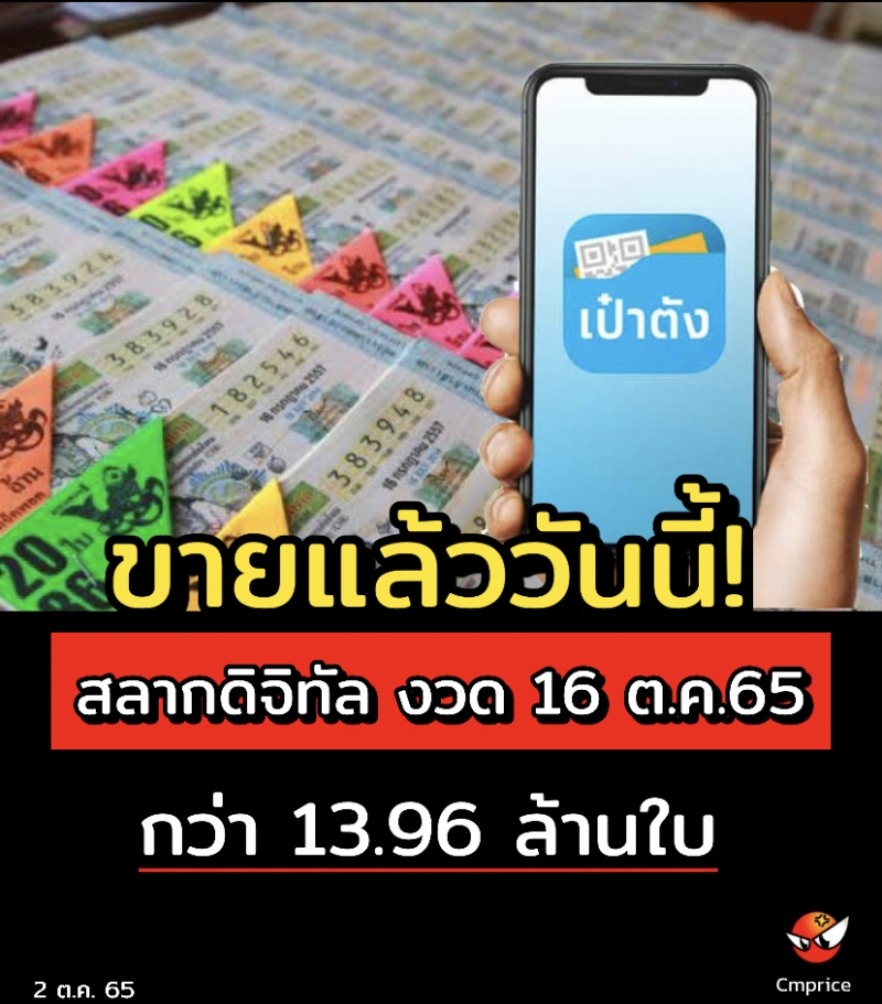 สำนักงานสลากกินแบ่งรัฐบาล เปิดขายสลากดิจิทัล งวดที่ 16 ตุลาคม 2565 แล้ว ตั้งแต่วันที่ 2 ตุลาคม 2565 เป็นต้นไปจนกว่าสลากจะหมด สามารถซื้อผ่านแอปเป๋าตังได้ตั้งแต่เวลา 06.00 - 23.00 น. ในงวดนี้ ได้เพิ่มสลากเป็น13,964,500 ใบ โดยสลากทั้งหมดเป็นของตัวแทนจำหน่าย 27,929 ราย
