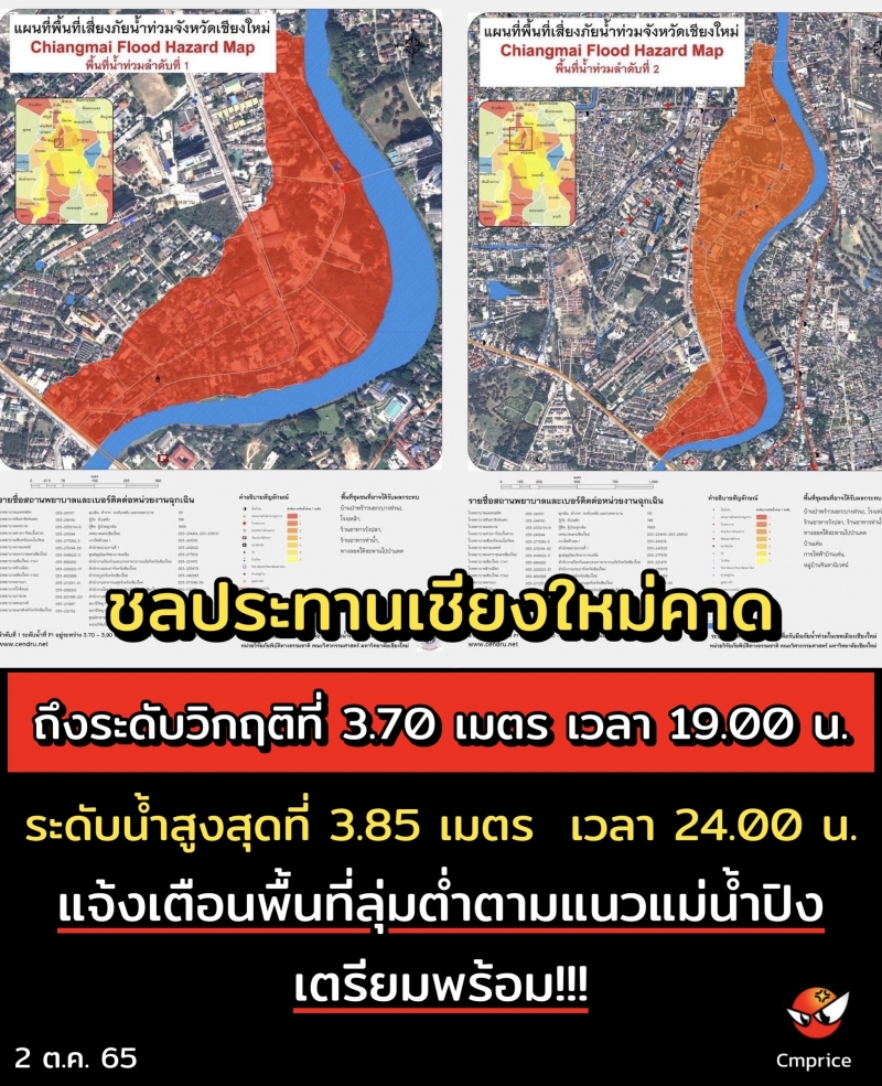 | • ชลประทานเชียงใหม่คาดสถานการณ์น้ำที่ สถานี P.1 (สะพานนวรัฐ) ระดับน้ำสูงสุดที่ 3.85 เมตร ในเวลาประมาณ 24.00 น. และถึงระดับวิกฤติที่ 3.70 เมตร เวลา 19.00 น. |