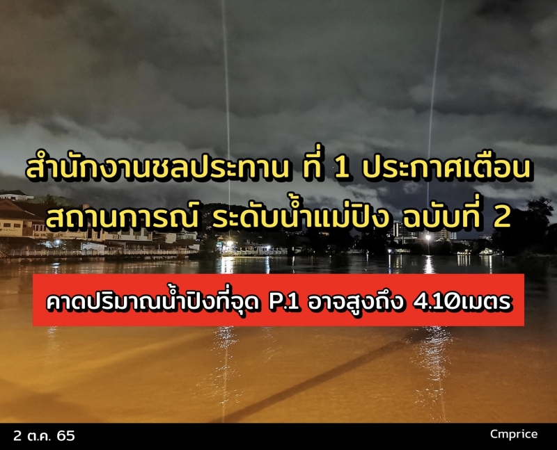 สำนักงานชลประทานที่ 1 ได้ประเมินสถานการณ์น้ำในแม่น้ำปิงเมื่อเวลา 21.00 น. (วันที่ ๒ ตุลาคม ๒๕๖๕) คาดการณ์ว่าปริมาณน้ำที่สถานี P.1 สะพานนวรัฐ มีแนวโน้มสูงถึงระดับวิกฤติที่ระดับ 4.00-4.10 เมตร ในวันจันทร์ที่ 3 ตุลาคม2565 ช่วงเวลา 04.00-06.00 น. ทั้งนี้ สำนักงานชลประทานที่ 1 จะติดตาม/เฝ้าระวังสถานการณ์น้ำอย่างใกล้ชิดและรายงานให้ทราบอย่างต่อเนื่อง และขอให้พื้นที่ลุ่มต่ำตามแนวแม่น้ำปิง เตรียมพร้อมรับสถานการณ์น้ำตามแนวแม่น้ำปิงที่เพิ่มสูงขึ้นดังกล่าวด้วย