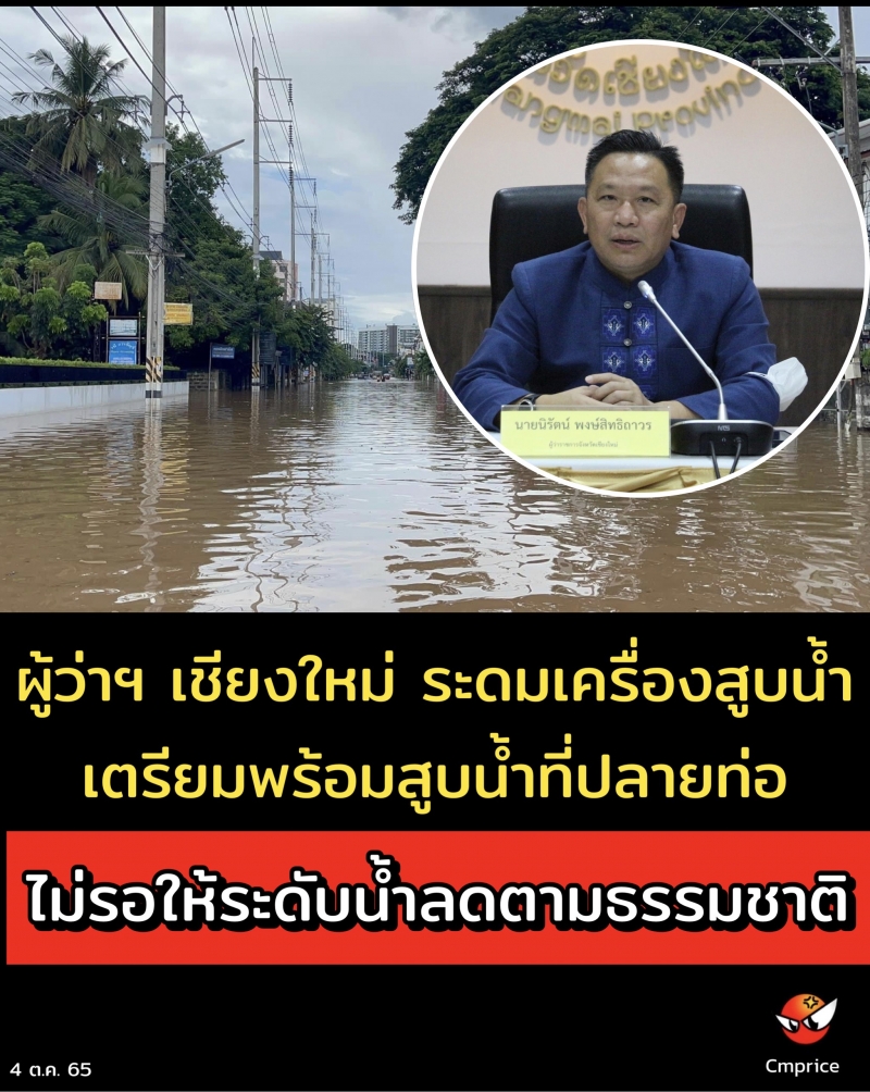 ผู้ว่าราชการจังหวัดเชียงใหม่ ระดมเครื่องสูบน้ำจากหลายพื้นที่ เตรียมพร้อมช่วยสูบน้ำที่ปลายท่อ ไม่รอให้ระดับน้ำลดลงงตามธรรมชาติเพียงอย่างเดียว เผยเตรียมแผนแก้ปัญหาระยะยาว เพื่อป้องกันน้ำท่วมเชียงใหม่อย่างถาวร