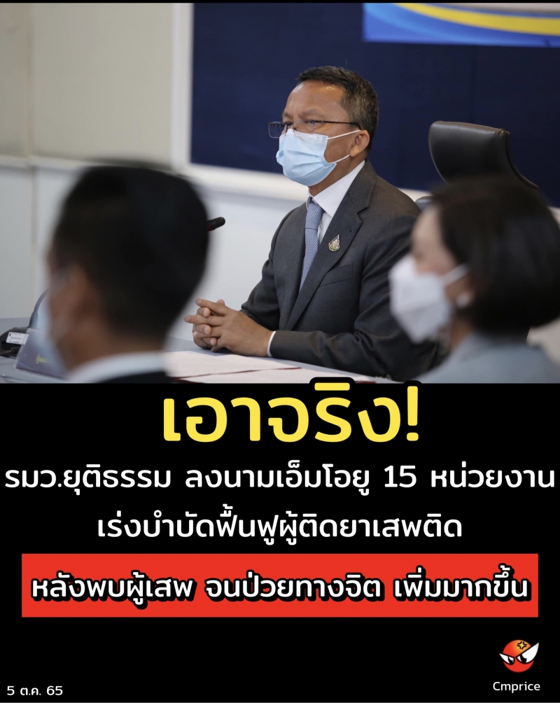 วันที่ 3 ตุลาคม 2565 เมื่อเวลา 10.00 น. นายสมศักดิ์ เทพสุทิน รัฐมนตรีว่าการกระทรวงยุติธรรม เป็นประธานการประชุมหารือแนวทางการแก้ไขปัญหาผู้มีอาการทางจิตจากการใช้สารเสพติด และพิธีลงนามบันทึกข้อตกลงว่าด้วยความร่วมมือ เพื่อการป้องกัน เฝ้าระวัง และแก้ไขปัญหาผู้ป่วยที่มีอาการทางจิต อันเนื่องมาจากการใช้ยาเสพติด ที่สำนักงาน ป.ป.ส. โดยมี น.ส.ณัฐธ์ภัสส์ ยงใจยุทธ ผู้ช่วย รมว.ยุติธรรม นายวิชัย ไชยมงคล เลขาธิการ ป.ป.ส. และผู้แทน 15 หน่วยงาน เช่น กระทรวงสาธารณสุข กระทรวงมหาดไทย กระทรวงพัฒนาสังคมและความมั่นคงของมนุษย์สำนักงานตำรวจแห่งชาติ สถาบันการแพทย์ฉุกเฉินแห่งชาติ เข้าร่วม