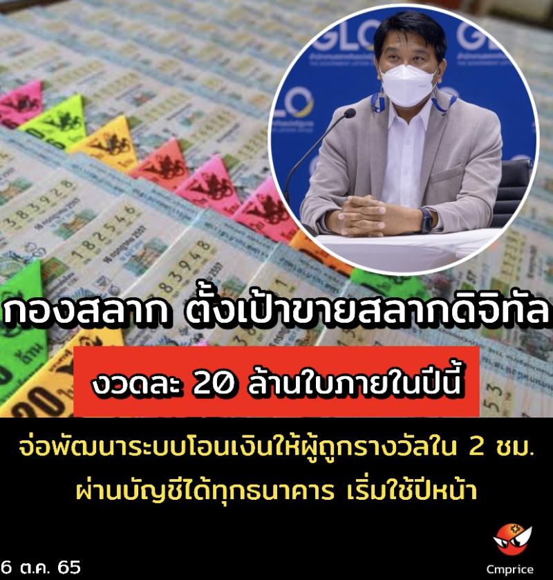 | • กองสลาก ตั้งเป้าขายสลากดิจิทัลงวดละ 20 ล้านใบภายในปีนี้ |