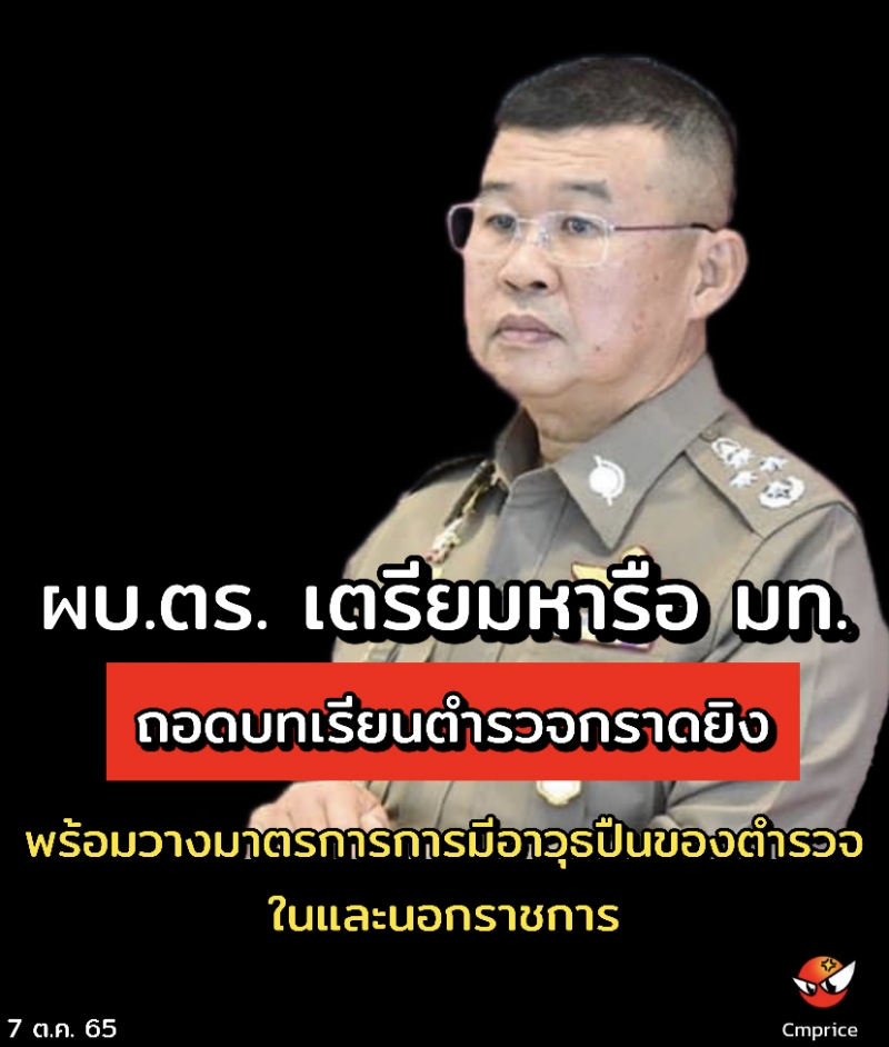 | • ผบ.ตร. เตรียมหารือ มท. ถอดบทเรียนตำรวจกราดยิง พร้อมวางมาตรการการมีอาวุธปืนของตำรวจในและนอกราชการ |