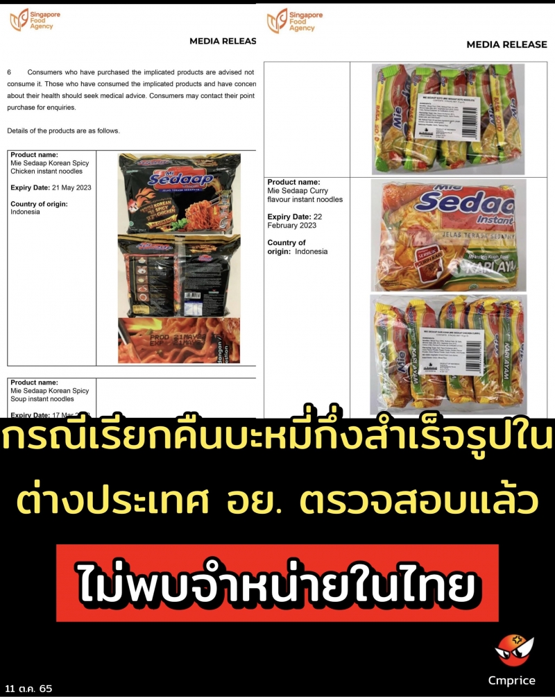 เภสัชกรวีระชัย นลวชัย รองเลขาธิการคณะกรรมการอาหารและยา เปิดเผยว่า ตามที่มีข่าวสำนักงานอาหารแห่งสิงคโปร์ได้เรียกคืนบะหมี่กึ่งสำเร็จรูป ตราหมี่ซีดาพ (Mie Sedaap) ผลิตในประเทศอินโดนีเซีย จำนวน 4 รายการเนื่องจากพบการปนเปื้อนสารเอทิลีนออกไซด์ ซึ่งเป็นส่วนประกอบของยาฆ่าแมลง รายละเอียดผลิตภัณฑ์ที่พบการปนเปื้อนในต่างประเทศตาม QR Code