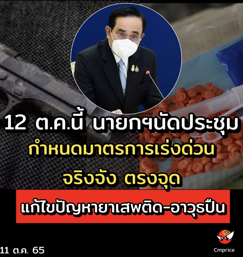 วันที่ 11 ตุลาคม 2565 นายอนุชา บูรพชัยศรี รองเลขาธิการนายกรัฐมนตรีฝ่ายการเมือง ปฏิบัติหน้าที่โฆษกประจำสำนักนายกรัฐมนตรี กล่าวว่า รัฐบาลให้ความสำคัญในการป้องกันและแก้ไขปัญหาอย่างจริงจังเกี่ยวกับการครอบครองอาวุธปืน ยาเสพติด ตลอดจนหาแนวทางการแก้ไขปัญหาทั้งระบบเพื่อป้องกันเหตุร้ายแรงที่อาจจะเกิดขึ้นอีกในอนาคต ดังนั้น พลเอก ประยุทธ์ จันทร์โอชา นายกรัฐมนตรีและรัฐมนตรีว่าการกระทรวงกลาโหม จึงได้สั่งการให้จัด“การประชุมเพื่อกำหนดมาตรการเร่งด่วนในการแก้ไขปัญหายาเสพติดและอาวุธปืน” ในวันพุธที่ 12 ตุลาคม 2565 เวลา 09.30 น. ณ ตึกภักดีบดินทร์ ทำเนียบรัฐบาล เพื่อกำหนดมาตรการในการแก้ไขปัญหาที่เกิดขึ้นอย่างจริงจัง โดยเฉพาะในเรื่องปัญหายาเสพติด การครอบครองอาวุธปืน การบำบัดฟื้นฟูผู้ติดยาเสพติด ซึ่งนายกรัฐมนตรีจะเป็นประธานการประชุม โดยผู้เข้าร่วมการประชุมประกอบด้วย พลเอก ประวิตร วงษ์สุวรรณ รองนายกรัฐมนตรี นายวิษณุเครืองาม รองนายกรัฐมนตรี นายอนุทิน ชาญวีรกูล รองนายกรัฐมนตรีและรัฐมนตรีว่าการกระทรวงสาธารณสุข นายดอน ปรมัตถ์วินัย รองนายกรัฐมนตรีและรัฐมนตรีว่าการกระทรวงการต่างประเทศ พลเอก อนุพงษ์ เผ่าจินดา รัฐมนตรีว่าการกระทรวงมหาดไทย นายสมศักดิ์ เทพสุทิน รัฐมนตรีว่าการกระทรวงยุติธรรม นายจุติ ไกรฤกษ์ รัฐมนตรีว่าการกระทรวงการพัฒนาสังคมและความมั่นคงของมนุษย์ นายสุชาติ ชมกลิ่น รัฐมนตรีว่าการกระทรวงแรงงาน นางสาวตรีนุช เทียนทอง รัฐมนตรีว่าการกระทรวงศึกษาธิการ พลเอก ชัยชาญ ช้างมงคล รัฐมนตรีช่วยว่าการกระทรวงกลาโหมรวมทั้งอัยการสูงสุด ศาล ผู้บัญชาการตำรวจแห่งชาติ และผู้ว่าราชการกรุงเทพมหานคร โดยให้กระทรวงยุติธรรมทำหน้าที่ฝ่ายเลขานุการในการประชุม