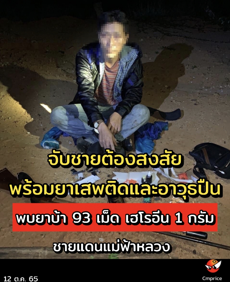 ห้วงกลางดึกวันที่ 11 ต.ค. 65 หน่วยเฉพาะกิจกรมทหารม้าที่ 2 กองกำลังผาเมือง ปฏิบัติภารกิจลาดตระเวนเฝ้าตรวจบริเวณ บ.พญาไพร ต.เทอดไทย อ.แม่ฟ้าหลวง จ.เชียงราย ตรวจพบชายต้องสงสัยท่าทางมีพิรุธ จึงได้แสดงตัวเพื่อขอทำการตรวจค้น ผลการตรวจค้นพบยาบ้า 93 เม็ด, เฮโรอีน 1 กรัม และ อาวุธปืนไทยประดิษฐ์ จำนวน 1 กระบอกหน่วยจึงควบคุมตัวผู้ต้องหาพร้อมของกลางส่งให้ สภ.แม่ฟ้าหลวง ดำเนินการตามกฎหมายต่อไป