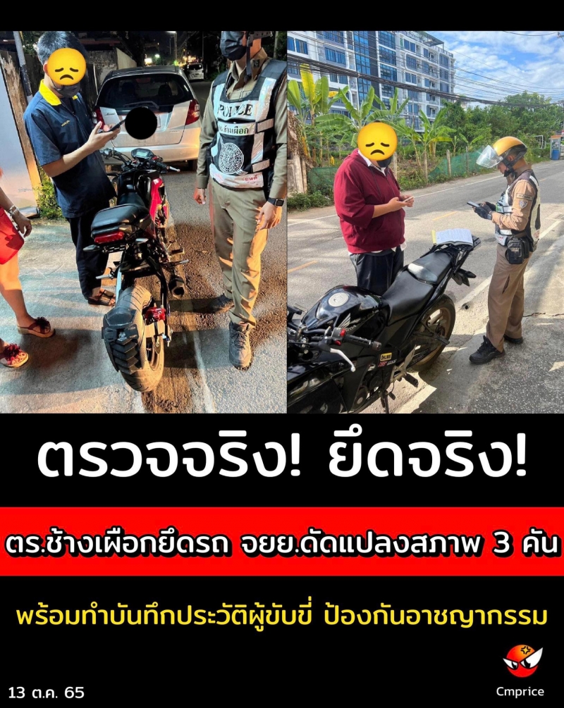 | • ตร.ช้างเผือก ตรวจจริง ยึดจริง ยึดรถ จยย. ดัดแปลงสภาพ 3 คัน พร้อมทำบันทึกประวัติผู้ขับขี่ ป้องกันอาชญากรรม |