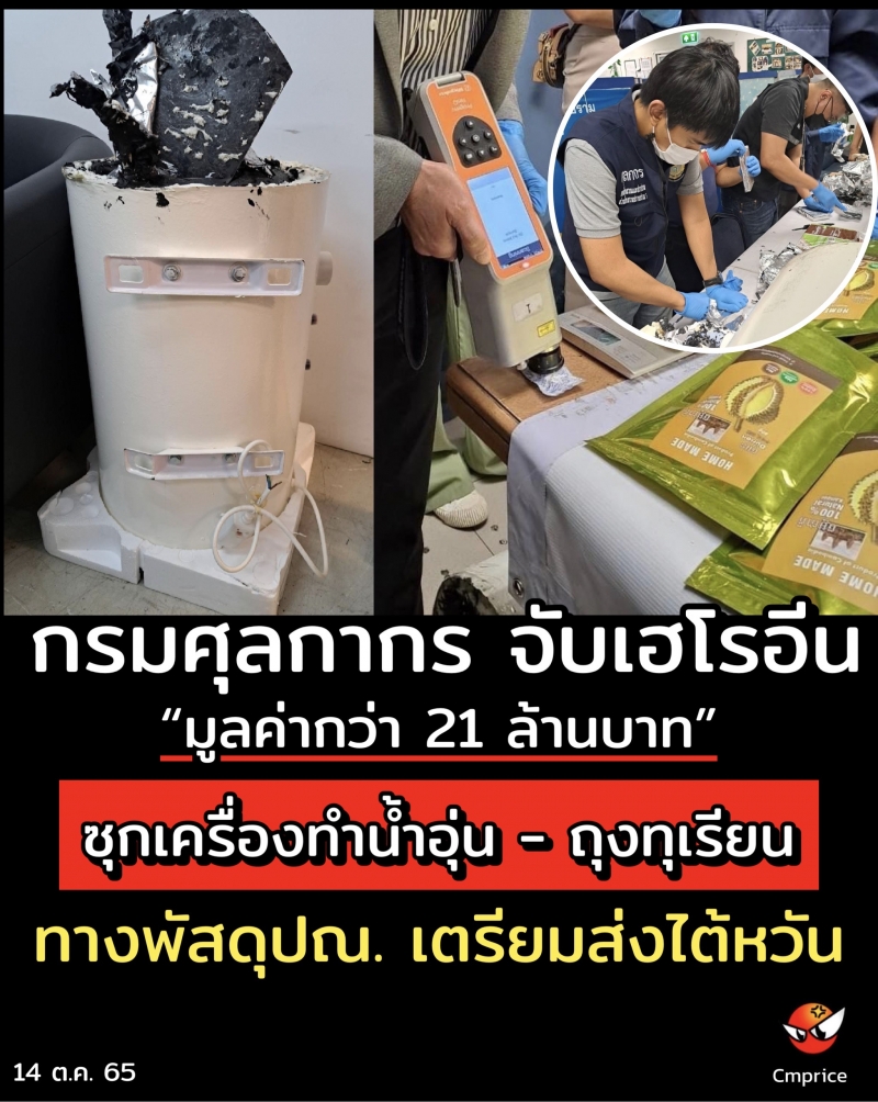 จนกระทั่งเมื่อวันที่ 12 ตุลาคม 2565 เจ้าหน้าที่กรมศุลกากร ตรวจพบพัสดุไปรษณีย์ต้องสงสัย เมื่อเปิดตรวจพบเครื่องทำน้ำอุ่น จำนวน 1 เครื่อง และทุเรียนอบแห้ง จำนวน 4 ลัง ต้นทางจากประเทศกัมพูชา ผ่านประเทศไทย ปลายทางไต้หวัน ทางท่าอากาศยานสุวรรณภูมิ ดังนั้น ชุดปฏิบัติการ Airport Interdiction Task Force (AITF) ประกอบด้วยกรมศุลกากร สำนักงาน ป.ป.ส. กองบัญชาการตำรวจปราบปรามยาเสพติด และศูนย์รักษาความปลอดภัย กองบัญชาการกองทัพไทย ร่วมกันตรวจสอบ พบเฮโรอีนอัดแท่ง ตราสัญลักษณ์สิงโตเหยียบลูก จำนวน 10 แท่ง น้ำหนักประมาณ 3,700 กรัม ซุกซ่อนอยู่ในเครื่องทำน้ำอุ่น ดัดแปลงขึ้นใหม่จำนวน 1 เครื่อง และพบเฮโรอีนบรรจุอยู่ภายในซองกันชื้น น้ำหนักประมาณ 3,510 กรัม ซุกซ่อนอยู่ใน