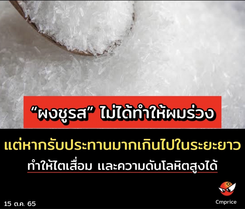 | • ผงชูรส ไม่ได้ทำให้ผมร่วง แต่หากรับประทานมากเกินไปในระยะยาวจะส่งผลให้ไตเสื่อม เเละความดันโลหิตสูงได้ |