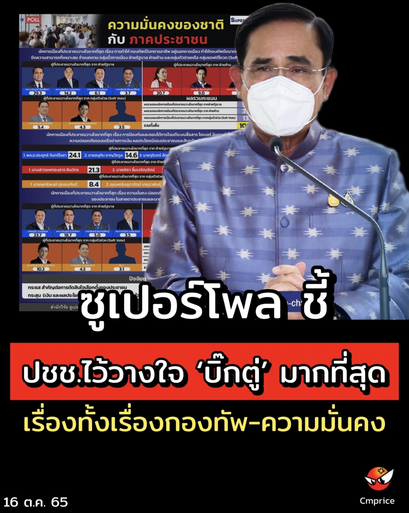| • ซูเปอร์โพล ชี้ "บิ๊กตู่" เป็นคนที่ประชาชนไว้ใจที่สุด ทั้งเรื่องกองทัพและความมั่นคง |