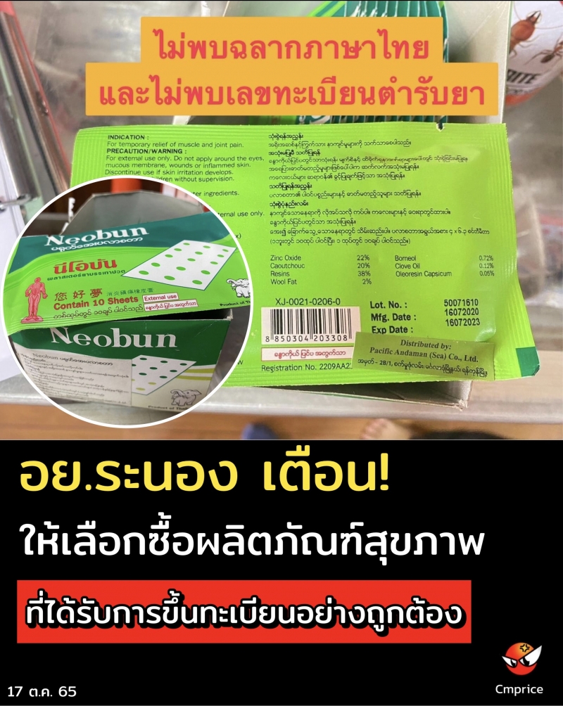 กลุ่มงานคุ้มครองผู้บริโภคและเภสัชสาธารณสุข สำนักงานสาธารณสุขจังหวัดระนอง ร่วมกับสำนักงานสาธารณสุขอำเภอ และโรงพยาบาลชุมชน ลงพื้นที่บูรณาการงานเภสัชกรรมปฐมภูมิ เพื่อขับเคลื่อนการส่งเสริมการใช้ยาอย่างสมเหตุผลในร้านชำ จากการตรวจสอบเฝ้าระวังพบการจำหน่ายผลิตภัณฑ์ยา “Neobun นีโอบัน” ที่ไม่มีฉลากภาษาไทยและไม่ได้รับการขึ้นทะเบียนตำรับยาในประเทศไทย กระจายอยู่ในร้านชำหลายแห่งในพื้นที่อำเภอกระบุรี จังหวัดระนอง