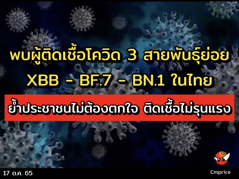 | • กรมวิทยฯ พบผู้ติดเชื้อโควิด 3 สายพันธุ์ย่อย XBB - BF.7 - BN.1 ในไทย ย้ำประชาชนไม่ต้องตกใจ ติดเชื้อไม่รุนแรง |