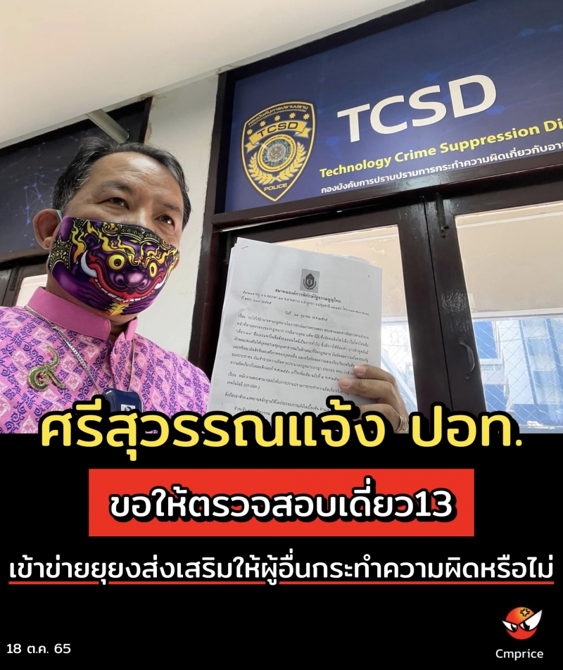 วันนี้18 ต.ค. 65 เวลา 10.30 น. ที่ บก.ปอท. นายศรีสุวรรณ จรรยา เลขาธิการสมาคมองค์การพิทักษ์รัฐธรรมนูญไทยได้เดินทางมาพบพนักงานสอบสวน กองบังคับการปราบปรามการกระทำความผิดเกี่ยวกับอาชญากรรมทางเทคโนโลยี (บก.ปอท.) เพื่อขอให้ดำเนินการตามอำนาจหน้าที่ตามครรลองของกฎหมาย กรณีมีบุคคลทอล็คโชว์เดี่ยวไมโครโฟน-13 ซึ่งเผยแพร่ในสื่อสังคมออนไลน์ ซึ่งมีการใช้ถ้อยคำ บางคำพูดอันอาจมีลักษณะส่งเสริมให้บุคคลร่วมชุมนุมสาธารณะที่ผิดกฎหมาย ซึ่งอาจขัดต่อความมั่นคงของรัฐและหรือละเมิดสิทธิและเสรีภาพของบุคคลอื่น และหรือขัดต่อความสงบเรียบร้อยหรือศีลธรรมอันดีของประชาชน อันเข้าข่ายความผิดตามประมวลกฎหมายอาญา ประกอบพรบ.ว่าด้วยการกระทําความผิดเกี่ยวกับคอมพิวเตอร์ 2550 แก้ไขเพิ่มเติม ฉบับที่ 2 พ.ศ.2560 หรือไม่ อย่างไร