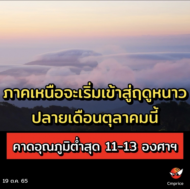 ศูนย์อุตุนิยมวิทยาภาคเหนือ เผย พื้นที่ภาคเหนือ จะเริ่มเข้าสู่ฤดูหนาวอย่างเป็นทางการในช่วงปลายเดือนตุลาคม นี้คาดเชียงใหม่ จะมีอุณภูมิต่ำสุดอยู่ที่ 11-13 องศาเซลเซียส