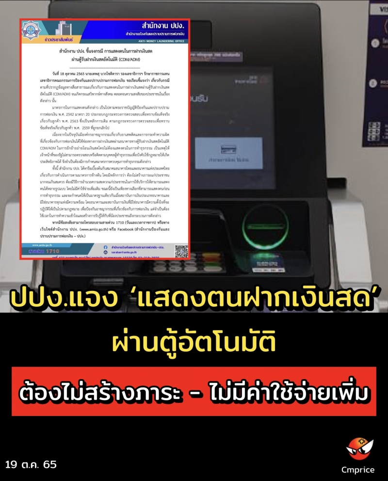 สำนักงานปปง.แจง ‘แสดงตนฝากเงินสด’ ผ่านตู้รับฝากเงินสดอัตโนมัติ CDM/ADM