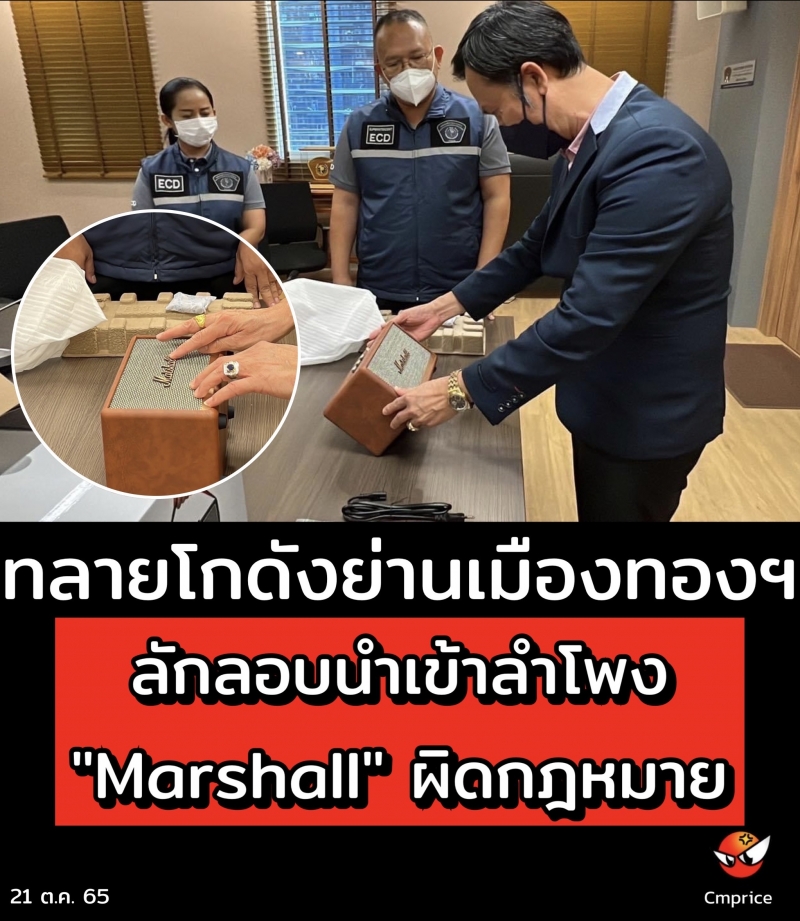 สืบเนื่องจากเจ้าหน้าที่ตำรวจ กก.2 บก.ปอศ. สืบทราบว่ามีการลักลอบจำหน่ายลำโพงยี่ห้อ Marshall ที่นำเข้ามาโดยผิดกฎหมายในท้องตลาด โดยมีการเก็บสินค้าไว้ที่โกดังแห่งหนึ่งย่านเมืองทองฯ วันนี้ (20 ต.ค.65) เจ้าหน้าที่ตำรวจกก.2 บก.ปอศ. จึงได้นำหมายค้นเข้าตรวจค้นโกดังดังกล่าว พบลำโพงยี่ห้อ Marshall จำนวนหลายรายการ ซึ่งไม่มีการเอกสารการแสดงการนำเข้าและเสียภาษี เจ้าหน้าที่จึงได้ทำการตรวจยึดไว้เพื่อดำเนินการตามกฎหมาย
