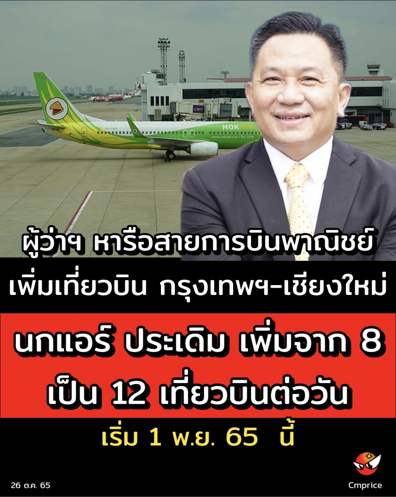 ผู้ว่าฯ หารือสายการบินพาณิชย์ เพิ่มเที่ยวบิน กรุงเทพฯ-เชียงใหม่ นกแอร์ ประเดิม เพิ่มจาก 8 เป็น 12 เที่ยวบินต่อวัน เริ่ม 1 พ.ย. 65 นี้