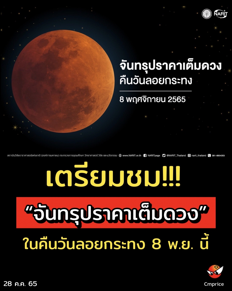 พิเศษ ! คืนวันที่ 8 พฤศจิกายน 2565 สดร. จัดกิจกรรมสังเกตการณ์จันทรุปราคาเต็มดวงคืนวันลอยกระทง พบกันได้ที่จุดสังเกตการณ์หลักทั้ง 4 แห่ง ได้แก่
