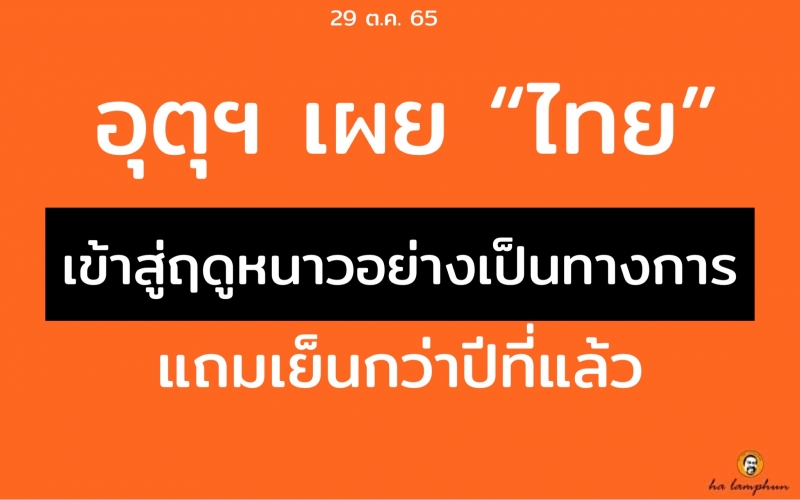 วานนี้ (28 ตุลาคม 2565) เวลา 10.00 น. ดร. ชมภารี ชมภูรัตน์ อธิบดีกรมอุตุนิยมวิทยา แถลงกับผู้สื่อข่าว เปิดเผยการเข้าสู่ฤดูหนาวของประเทศไทย ประจำปี 2565 ณ ศูนย์ปฏิบัติการพยากรณ์อากาศ ชั้น 11 อาคาร 50 ปีอุตุนิยมวิทยา โดยกล่าวว่า ฤดูหนาวของประเทศไทยปีนี้ เริ่มต้นช้ากว่าปกติประมาณ 2 สัปดาห์ เนื่องจากการเปลี่ยนแปลงของทิศทางลมชั้นบนระดับล่าง ได้เปลี่ยนเป็นลมตะวันออกหรือตะวันออกเฉียงเหนือ และลมชั้นบนระดับบนได้เปลี่ยนเป็นลมตะวันตก รวมถึงเกณฑ์ของอุณหภูมิและปริมาณฝนในตอนบนของประเทศได้ลดลงอย่างต่อเนื่องทำให้ฤดูหนาวในปีนี้จะเริ่มขึ้นในวันที่ 29 ต.ค. 2565 และจะสิ้นสุดฤดูในช่วงกลางเดือนกุมภาพันธ์ 2566 บริเวณประเทศไทยตอนบนจะมีอุณหภูมิต่ำสุดเฉลี่ย 20-21 °ซ. ซึ่งจะสูงกว่าค่าปกติประมาณประมาณ 0.5 °ซ. (ค่าปกติ 19.9 ° ซ.) แต่จะมีอากาศหนาวเย็นมากกว่าปีที่ผ่านมา (อุณหภูมิต่ำสุดเฉลี่ยปีที่ผ่านมา 21 °ซ.) บริเวณตอนบนของประเทศอย่างภาคเหนือและภาคตะวันออกเฉียงเหนือ จะมีอุณหภูมิต่ำสุด 8-9 °ซ โดยเฉพาะในจังหวัดเชียงราย น่านสกลนคร และนครพนม อุณหภูมิต่ำที่สุดบริเวณกรุงเทพมหานคร 17-18 °ซ. และปริมณฑล 15-16 °ซ. ช่วงเวลาที่จะมีอากาศหนาวเย็นที่สุดจะเริ่มตั้งแต่เดือนธันวาคม 2565 ถึงปลายเดือนมกราคม 2566