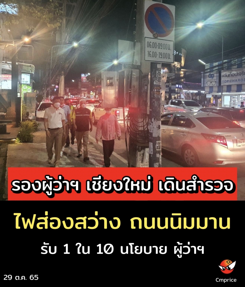 รองผู้ว่าราชการจังหวัดเชียงใหม่ ลงพื้นที่เดินสำรวจไฟส่องสว่าง ถนนนิมมานเหมินทร์ รับ 1 ใน 10 นโยบาย ผู้ว่าฯ“เชียงใหม่ มาได้ทุกวัน” ด้วยมีถนนปลอดภัย สนามบินสะดวก และอากาศสะอาด