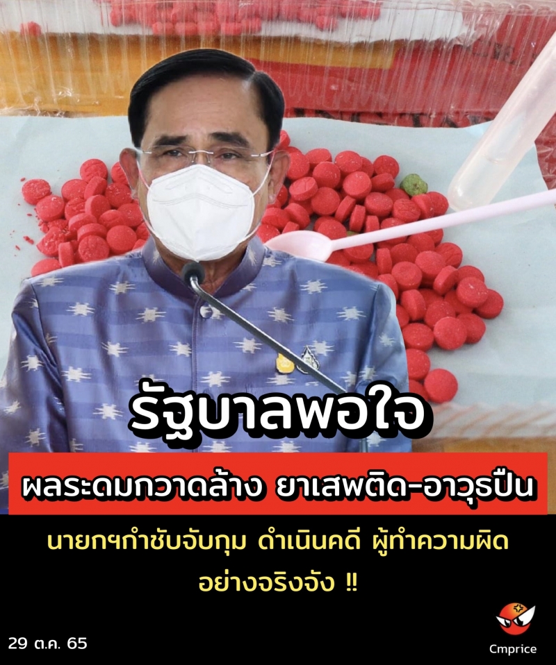 วันที่ 29 ตุลาคม 2565 นายอนุชา บูรพชัยศรี รองเลขาธิการนายกรัฐมนตรีฝ่ายการเมือง ปฏิบัติหน้าที่โฆษกประจำสำนักนายกรัฐมนตรี เผยว่าตามที่ พลเอก ประยุทธ์ จันทร์โอชา นายกรัฐมนตรีและรัฐมนตรีว่าการกระทรวงกลาโหมนายกรัฐมนตรีได้มีมาตรการสำคัญในการแก้ไขปัญหาอาวุธปืน และยาเสพติดที่เป็นรูปธรรมอย่างจริงจัง โดยเน้นย้ำให้ทุกฝ่ายบูรณาการร่วมกันแก้ปัญหา นำหน่วยงานในท้องถิ่น และประชาชนในพื้นที่เข้ามามีส่วนร่วมในการแก้ไขปัญหา ซึ่งสำนักงานตำรวจแห่งชาติได้ประสานหน่วยงานที่เกี่ยวข้อง และแสวงหาความร่วมมือจากทุกภาคส่วนในการแก้ไขปัญหาอย่างต่อเนื่อง เข้มข้น เพื่อให้การปฏิบัติเป็นรูปธรรมชัดเจน โดยได้กำหนดให้มีการระดมกวาดล้างยาเสพติดและอาวุธปืนอย่างจริงจัง โดยผลการระดมกวาดล้างยาเสพติดในช่วงวันที่ 10-19 ต.ค. 65 ภาพรวมการปฏิบัติเป็นไปด้วยความเรียบร้อย และมีผลการดำเนินการจับกุมบุคคลตามหมายจับคดีอาญาได้ 3,884 หมายจับ ผู้ต้องหาคดียาเสพติด 15,710 คดี (ผู้ต้องหา 15,866 คน) ของกลางยาบ้า 18,314,853 เม็ด ยาไอซ์ 297,690 กรัม เฮโรอีน30,735 กรัม ยาอี 6,550 กรัม ความผิดเกี่ยวกับอาวุธปืน วัตถุระเบิด และเครื่องกระสุน ทั้งสิ้น 3,984 คดี ยึดของกลางอาวุธปืนสงคราม 27 กระบอก ปืนไม่มีทะเบียน 2,438 กระบอก มีทะเบียน 452 กระบอก วัตถุระเบิด 600 รายการ และเครื่องกระสุน 16,168 นัด โดยการจับกุมแบ่งเป็นการจับกุมความผิดเกี่ยวกับการจำหน่ายอาวุธปืนฯ โดยผิดกฎหมาย ทั้งทางตรงและทางออนไลน์ จำนวน 97 คดี ผู้ต้องหา 63 คน ยึดของกลางอาวุธปืนไม่มีทะเบียน 46 กระบอก มีทะเบียน 12 กระบอก วัตถุระเบิด 156 รายการ เครื่องกระสุน 1,296 นัด และความผิดเกี่ยวกับอาวุธปืนฯ อื่นๆ จำนวน 3,887 คดี (จับกุมผู้ต้องหา 3,864 คน) พร้อมของกลาง อาวุธปืนสงคราม 27 กระบอก อาวุธปืน (ไม่มีทะเบียน) 2,392 กระบอก มีทะเบียน 440 กระบอก วัตถุระเบิด 444 รายการ เครื่องกระสุน 14,872 นัด