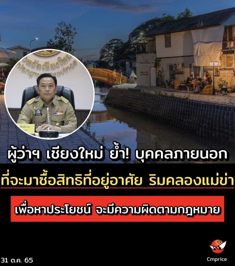 | • ผู้ว่าฯ เชียงใหม่ ย้ำ บุคคลภายนอกที่จะมาซื้อสิทธิที่อยู่อาศัย ริมคลองแม่ข่า เพื่อหาประโยชน์ จะมีความผิดตามกฎหมาย |