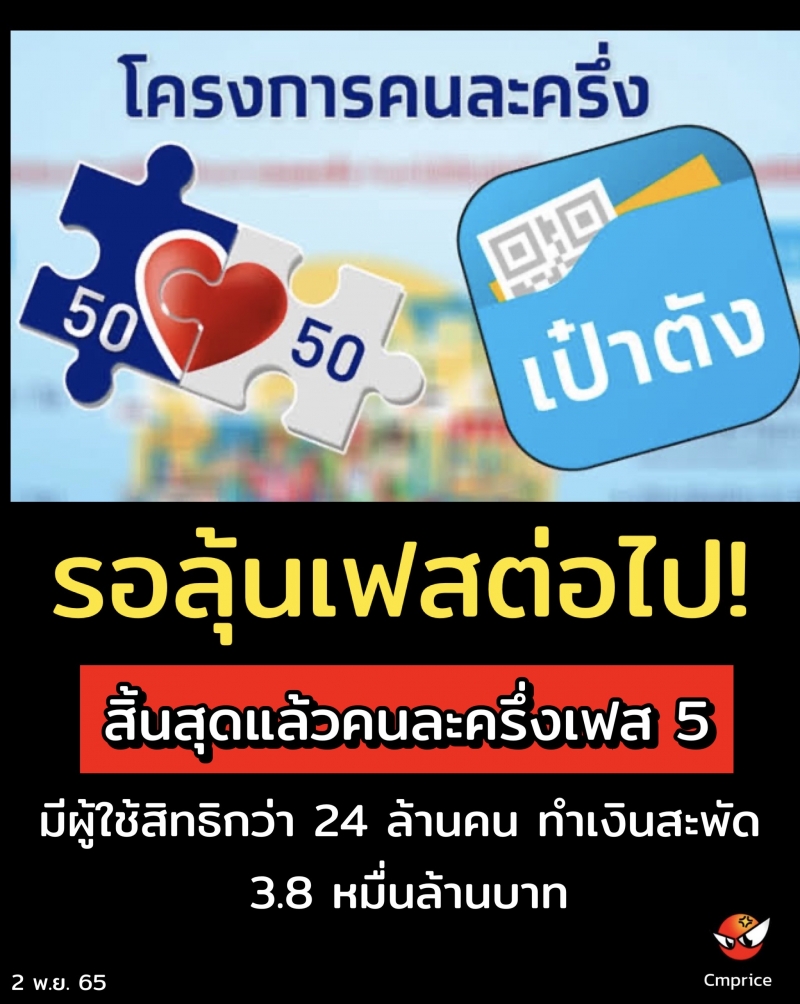 สิ้นสุดแล้ว! คนละครึ่งเฟส 5 มีผู้ใช้สิทธิกว่า 24 ล้านคน ทำเงินสะพัด 3.8 หมื่นล้านบาท รอลุ้นเฟสต่อไป!
