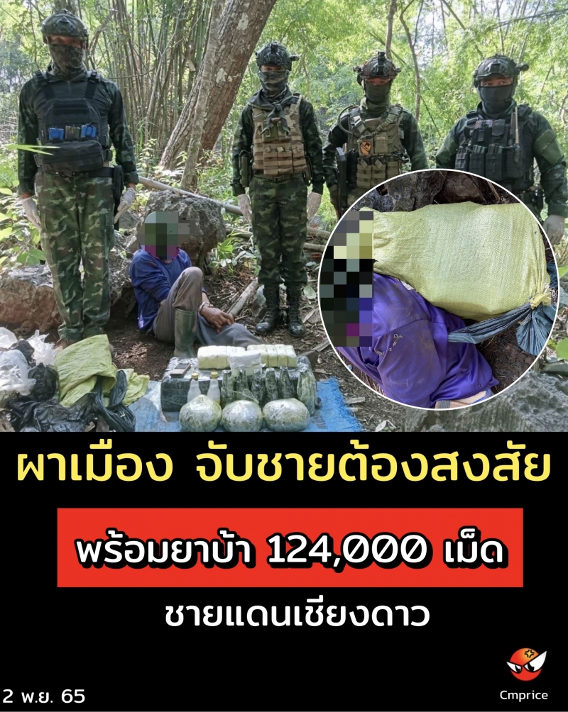 ผาเมือง จับชายต้องสงสัยพร้อมยาบ้า 124,000 เม็ด ชายแดนเชียงดาว