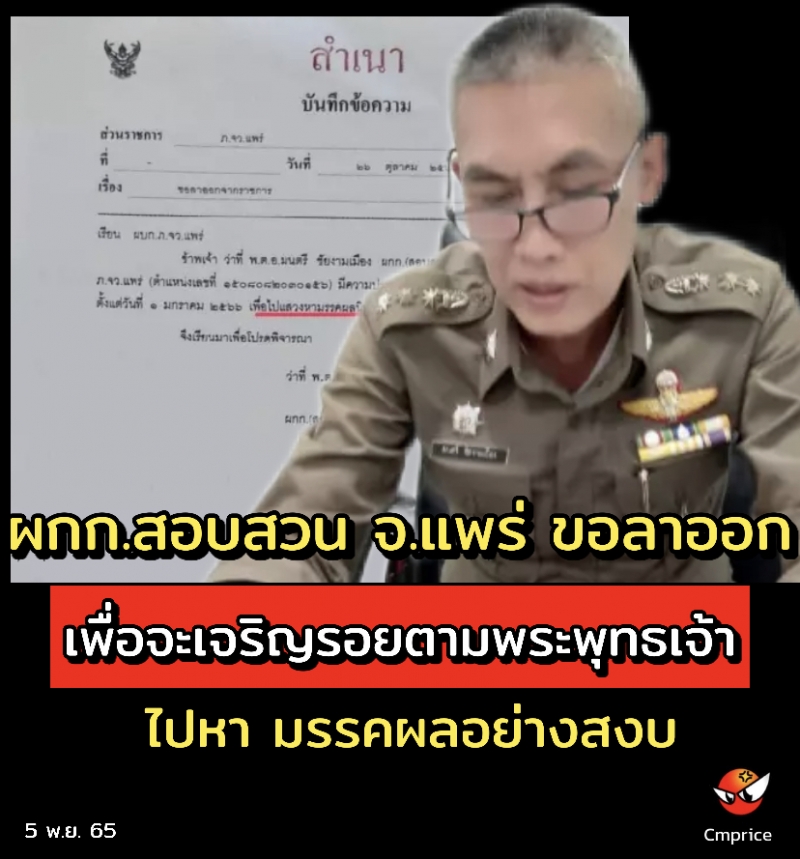 | • ผกก.สอบสวน จ.แพร่ ขอลาออกเพื่อออกเดินตามรอยพระพุทธเจ้าไปหา มรรคผลอย่างสงบ |