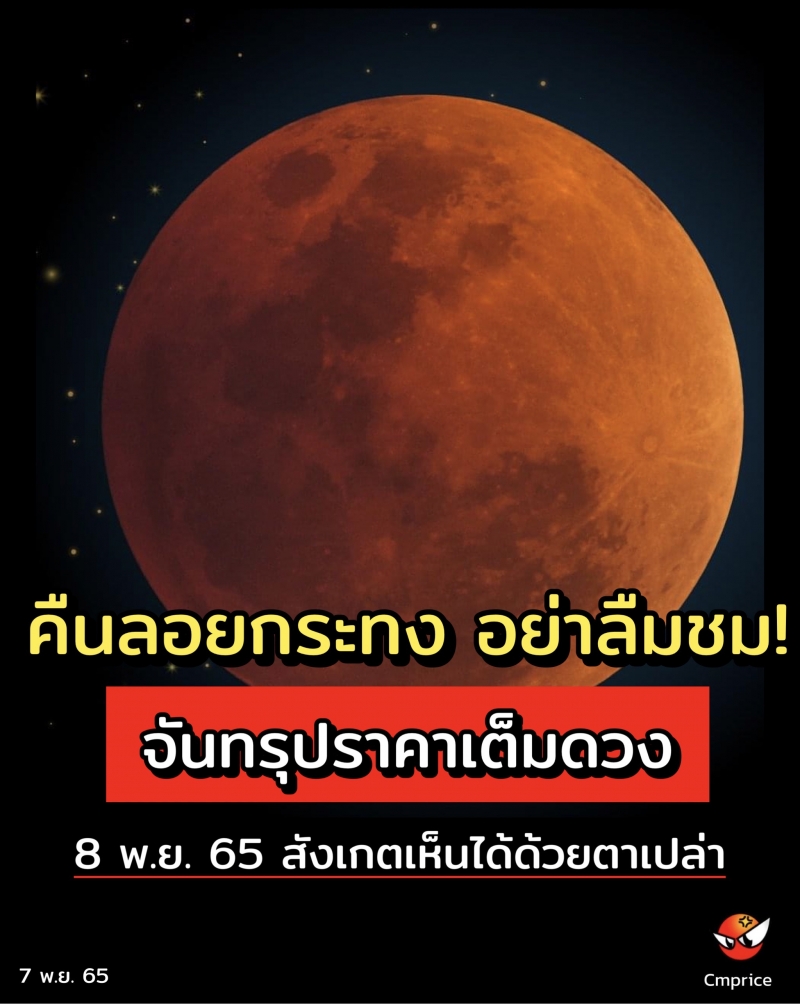 สถาบันวิจัยดาราศาสตร์แห่งชาติ (องค์การมหาชน) เผย วันที่ 8 พ.ย.65 ซึ่งตรงกับวันลอยกระทง จะเกิดปรากฏการณ์จันทรุปราคา ตั้งแต่เวลาประมาณ 15:02 - 20:56 น. (ตามเวลาประเทศไทย) สามารถสังเกตได้จากหลายพื้นที่ทั่วโลก
