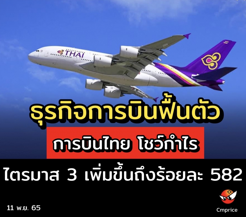 บริษัท การบินไทย จำกัด (มหาชน) ประกาศผลการดำเนินงานประจำไตรมาสที่ 3 ของปี 2565 โดยบริษัทฯ และบริษัทย่อยมีกำไรจากการดำเนินงานไม่รวมรายการที่เกิดขึ้นครั้งเดียว 3,920 ล้านบาท เทียบกับการขาดทุน 5,310 ล้านบาทในช่วงเดียวกันของปีก่อน มีรายได้รวมทั้งสิ้น 32,860 ล้านบาท เพิ่มขึ้นร้อยละ 582 จากไตรมาส 3 ของปี 2564 โดยเป็นรายได้การขนส่งผู้โดยสารและสินค้า 30,890 ล้านบาท ซึ่งเป็นผลจากการเพิ่มความถี่เที่ยวบินช่วง 6 เดือนแรกของปี เช่น เส้นทางลอนดอน แฟรงก์เฟิร์ต เจนไน เบงกาลูรู นิวเดลี มุมไบ สิงคโปร์ โคเปนเฮเกน มิวนิก เป็นต้นและกลับไปทำการบินในเส้นทางเดิมก่อนการแพร่ระบาดของเชื้อไวรัสโควิด-19 เช่น เส้นทาง ปีนัง โตเกียว (ฮาเนดะ) และบรัสเซลส์ ประกอบกับอัตราบรรทุกผู้โดยสารรวมเฉลี่ยเพิ่มขึ้นมากเป็นร้อยละ 77.0 เทียบกับร้อยละ 9.9 ในไตรมาสที่ 3 ของปี 2564