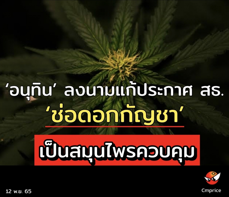 วันที่ 11 พฤศจิกายน 65 นายอนุทิน ชาญวีรกูล รองนายกรัฐมนตรีและรัฐมนตรีว่าการกระทรวงสาธารณสุข ลงนามในประกาศกระทรวงสาธารณสุข เรื่อง สมุนไพรควบคุม (ช่อดอกกัญชา) ฉบับปรับปรุง พ.ศ.2565 โดยเนื้อความในประกาศ ระบุว่า ให้ยกเลิกประกาศกระทรวงสาธารณสุข เรื่องสมุนไพรควบคุม (กัญชา) พ.ศ.2565 ลงนามวันที่ 16 มิ.ย.2565 โดยประกาศฉบับปรับปรุงให้ ‘เฉพาะส่วนของช่อดอก’ เป็นสมุนไพรควบคุม