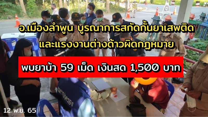 เมื่อวันที่ 11 พฤศจิกายน 2565 ชุดปฏิบัติการ อ.เมืองลำพูน ภายใต้การอำนวยการของ นายโยธิน ประสงค์ความดีนายอำเภอเมืองลำพูน ได้สั่งการให้ นายธนู ครั่งเนียม ปลัดอำเภอหัวหน้าฝ่ายความมั่นคง ร่วมกับเจ้าหน้าที่ตำรวจสภ.นิคมอุตสาหกรรม กำนัน ผู้ใหญ่บ้าน ตำบลศรีบัวบาน บูรณาการร่วมกัน ตั้งจุดตรวจ จุดสกัดยาเสพติดชั่วคราวรวมถึงคัดกรองการค้ามนุษย์ และแรงงานต่างด้าว ณ สามแยกศูนย์ปฏิบัติการพลังแผ่นดิน ในพื้นที่ ต.ศรีบัวบานอ.เมือง จ.ลำพูน