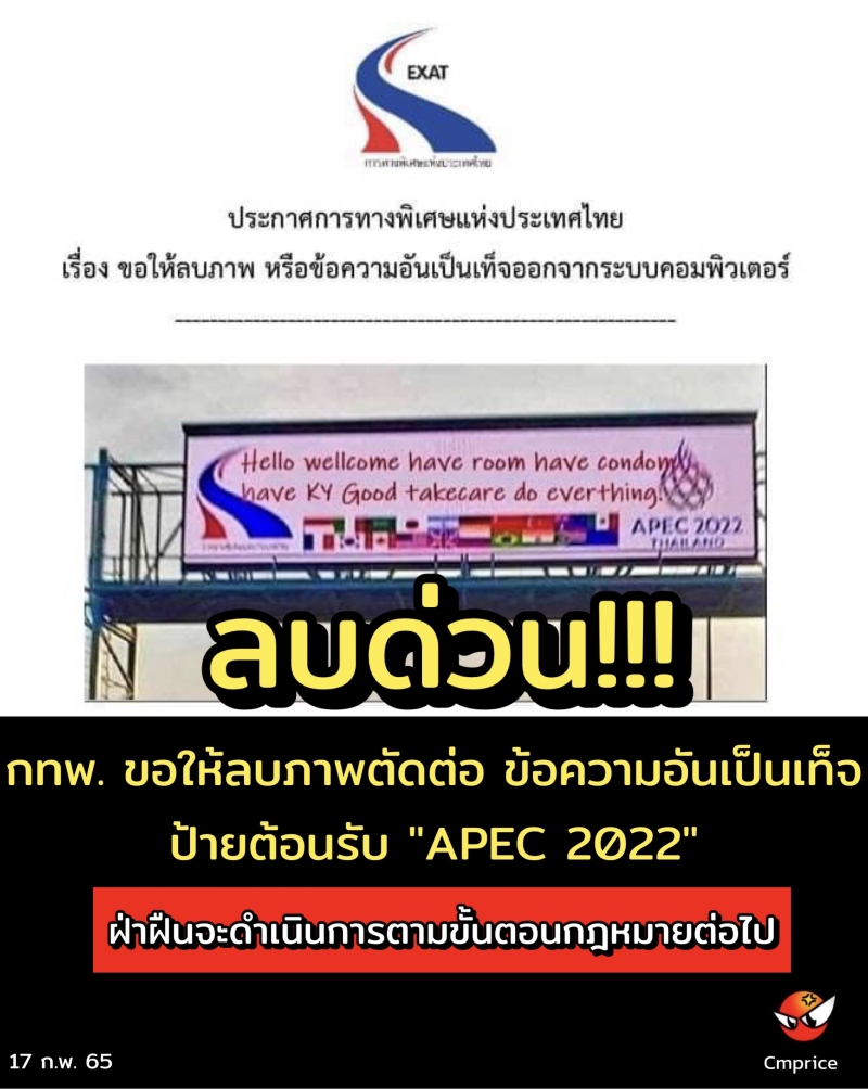 และวันนี้ทางเพจเฟซบุ๊กการทางพิเศษแห่งประเทศไทย ได้ออกมาเผยแพร่ข้อมูล จากทางฝ่ายกฎหมาย การทางพิเศษแห่งประเทศไทย โดยมีข้อความว่า "ให้ผู้กระทำการดังกล่าว ลบภาพและข้อความอันเป็นเท็จ ภายใน 24 ชั่วโมง หากยังเพิกเฉย การทางพิเศษฯ จะดำเนินการตามขั้นตอนกฎหมายต่อไป" ภายหลังที่มีผู้นำภาพป้ายข้อความต้อนรับผู้นำ เอเปค โดยมีข้อความอันเป็นเท็จมาเผยแพร่ และแชร์ต่อๆ กัน