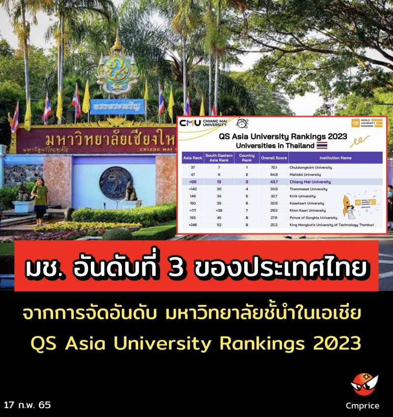 | • มช. อันดับที่ 3 ของประเทศไทย จากการจัดอันดับ มหาวิทยาลัยชั้นนำในเอเชีย QS Asia University Rankings 2023 |