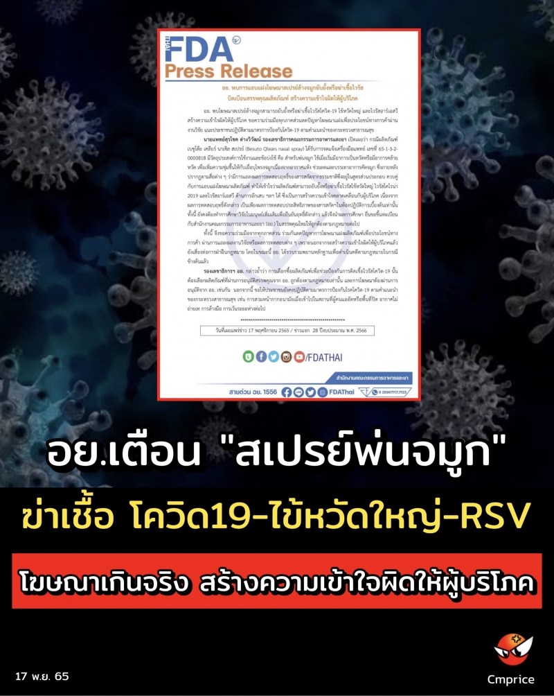 | • อย.เตือน "สเปรย์พ่นจมูก" ฆ่าเชื้อ โควิด19-ไข้หวัดใหญ่-ไวรัสอาร์เอสวี โฆษณาเกินจริง สร้างความเข้าใจผิดให้ผู้บริโภค |