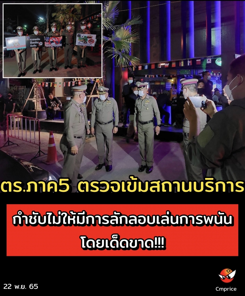 ค่ำวานนี้(21 พ.ย.65) พล.ต.ท.ปิยะ ต๊ะวิชัย ผบช.ภ.5 พร้อมด้วย พล.ต.ต.กฤตธาพล ยี่สาคร รอง ผบช.ภ.5, พล.ต.ต.เฉลิมพล จินตรัตน์ รอง ผบช.ภ.5 ,พล.ต.ต.พฤทธิพงษ์ ประยูรศิริ รอง ผบช.ภ.5 , พ.ต.อ.ทรงกริช ออนตะไคร้รอง ผบก.ภ.จว.เชียงใหม่, พ.ต.อ.ภูวนาท ดวงดี ผกก.สภ.เมืองเชียงใหม่ ,พ.ต.อ.นพฤทธิ์ กันธาผกก.สส.ภ.จว.เชียงใหม่ ได้ร่วมกันออกตรวจสถานบริการตามนโยบายการป้องกันและปราบปรามการลักลอบการเล่นการพนันทายผลฟุตบอลโลก 2022 ของ พล.ต.อ.ดำรงศักดิ์ กิตติประภัสร์ ผบ.ตร.