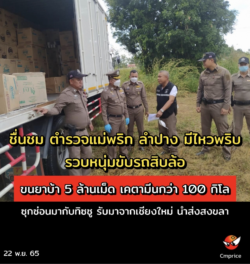 ผบ.ตร. ชื่นชม ตำรวจแม่พริก ลำปาง มีไหวพริบ รวบหนุ่มขับรถสิบล้อ ขนยาบ้า 5 ล้านเม็ด เคตามีนกว่า 100 กิโลตบตา เจ้าหน้าที่ซุกซ่อนมากับทิซซู รับมาจากเชียงใหม่ นำส่งสงขลา