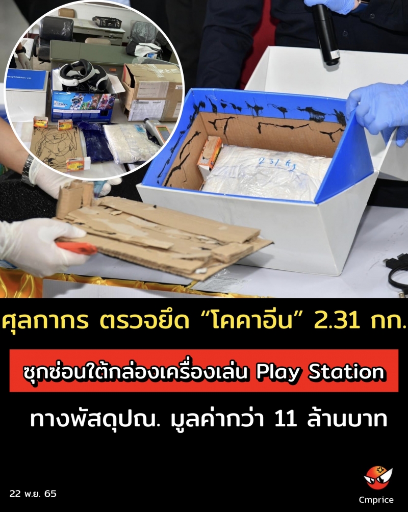 เมื่อวันท่ี 22 พฤศจิกายน 2565 เวลาประมาณ 9.00 น เจ้าหน้าที่ศุลกากรพบพัสดุ ไปรษณีย์ระหว่างประเทศ ประเภทพัสดุไปรษณีย์ทางอากาศ ต้นทางจากประเทศโปรตุเกส จํานวน 1 หีบห่อ มีลักษณะที่น่าสงสัย จึงร่วมกับ เจ้าหน้าที่จากสํานักงานคณะกรรมการป้องกันและปราบปรามยาเสพติด (ป.ป.ส.) เจ้าหน้าที่ตํารวจ และเจ้าหน้าที่ศูนย์รักษาความปลอดภัย กองบัญชาการกองทัพไทย (ศรภ.) เปิดตรวจพัสดุดังกล่าวร่วมกับพนักงาน บริษัท ไปรษณีย์ไทย จํากัดภายในพบกล่องเครื่องเล่น Play Station VR ซึ่งมีน้ําหนักมากกว่าปกติ ใต้กล่องพบว่ามีการซุกซ่อนถุงสีดํา ภายในพบห่อด้วยกระดาษ คาร์บอนสีน้ําเงิน หลังจากแกะกระดาษคาร์บอนสีน้ําเงินพบถุงพลาสติกใสบรรจุผงสีขาว เจ้าหน้าท่ีจึงนํา ผงสีขาวดังกล่าวไปทดสอบด้วยน้ํายา COBALT THIOCYANATE REAGENT พบว่าทําปฏิกิริยากับน้ํายาทดสอบพบเป็นยาเสพติดให้โทษประเภท 2 โคคาอีน ขาว น้ําหนักรวมส่ิงห่อหุ้มประมาณ 2.31 กิโลกรัม มลู ค่าประมาณ 11 ล้านบาท