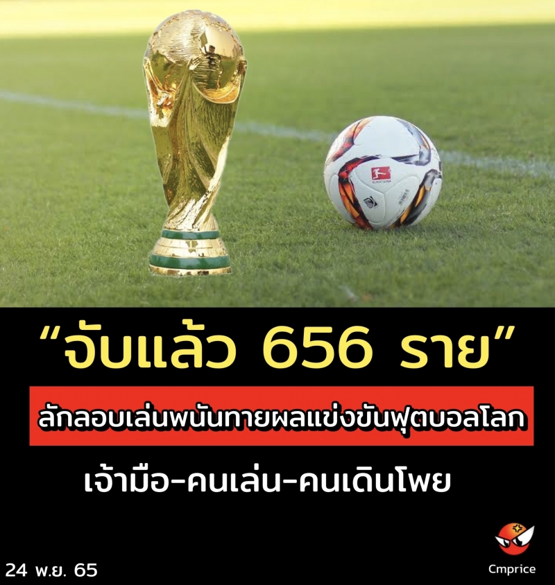 วันที่ 22 พฤศจิกายน 2565 ที่ผ่านมา มีผลการจับกุมการพนันทายผลฟุตบอลโลก โดยจับกุมผู้ต้องหา 411 ราย แบ่งเป็นเจ้ามือ 3 ราย ผู้เล่น 404 ราย และเดินโพย 4 ราย ส่วนผลการจับกุมการพนันทายผลฟุตบอลโลก ผ่านเว็บไซต์หรือสื่ออินเทอร์เน็ตต่าง ๆ ได้จับกุมผู้ต้องหา 43 ราย แบ่งเป็น เจ้ามือ 1 ราย และผู้เล่น 42 ราย พร้อมของกลาง โพยพนันฟุตบอลรวม 487 ใบ เป็นจำนวนเงินที่เล่นพนัน 79,440 บาท เงินสด 11,150 บาท