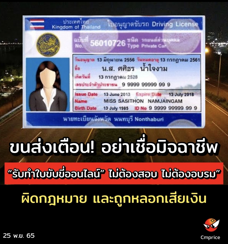 กรมการขนส่งทางบก เตือน! อย่าหลงเชื่อกลุ่มมิจฉาชีพแอบอ้างรับจัดทำหรือต่ออายุใบอนุญาตขับรถผ่านออนไลน์ ไม่ต้องสอบ ไม่ต้องอบรม รอรับได้เลย พร้อมเรียกค่าใช้จ่ายสูงประมาณ 1,000 - 5,000 บาท เมื่อผู้เสียหายโอนเงินไปแล้ว
