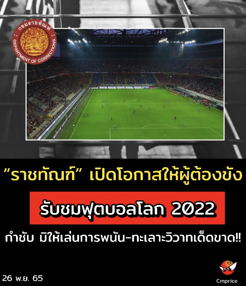 วันเสาร์ที่ 26 พฤศจิกายน 2565 นายอายุตม์ สินธพพันธุ์ อธิบดีกรมราชทัณฑ์ เปิดเผยว่า ตามที่สหพันธ์ฟุตบอลนานาชาติ (ฟีฟ่า) ได้จัดมหกรรมฟุตบอลโลกขึ้นในช่วงระหว่างวันที่ 20 พฤศจิกายน ถึงวันที่ 18 ธันวาคม 2565 ณประเทศกาตาร์ ซึ่งถือเป็นการแข่งขันฟุตบอลรายการสำคัญที่ทั่วโลกต่างเฝ้ารอ เพราะจัดขึ้นทุกๆ สี่ปี โดยประเทศไทยได้รับลิขสิทธิ์ถ่ายทอดสด จำนวน 64 แมตช์ ผ่านช่องทีวีดิจิทัล จำนวน 17 ช่อง นั้น