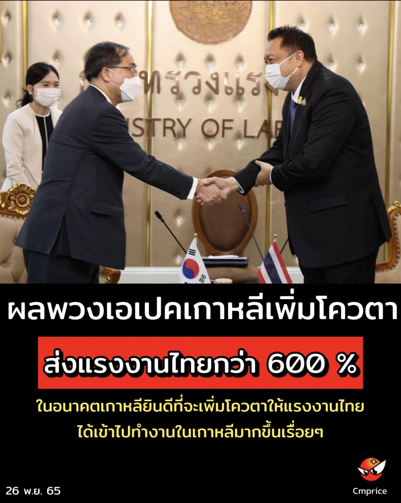 ในวันนี้ นายมุน ซึง-ฮย็อน (Mr. Moon Seoung-hyun) เอกอัครราชทูตวิสามัญผู้มีอำนาจเต็มแห่งสาธารณรัฐเกาหลีประจำประเทศไทย และคณะ ได้เข้ามาพบเพื่อเยี่ยมคารวะเนื่องในโอกาสเข้ารับตำแหน่งและหารือประเด็นด้านแรงงาน ซึ่งรัฐบาลไทยภายใต้การนำของท่าน พล.อ.ประยุทธ์ จันทร์โอชา นายกรัฐมนตรีและรัฐมนตรีว่าการกระทรวงกลาโหม และท่าน พล.อ.ประวิตร วงษ์สุวรรณ รองนายกรัฐมนตรี ที่กำกับดูแลกระทรวงแรงงาน ได้ให้ความสำคัญกับการจัดส่งแรงงานไทยไปทำงานต่างประเทศ เพื่อให้คนไทยมีงานทำ ยกระดับทักษะฝีมือ นำรายได้กลับมาพัฒนาประเทศ ซึ่งในเรื่องนี้เป็นพลพวงจากการประชุมเอเปคที่ผ่านมา เนื่องจากนายกรัฐมนตรีได้ให้เป็นตัวแทนไปส่งนายกรัฐมนตรีสาธารณรัฐเกาหลีภายหลังเสร็จสิ้นการประชุม และได้มีโอกาสพบปะพูดคุยกันในประเด็นความร่วมมือด้านแรงงาน โดยเฉพาะการแก้ไขปัญหาแรงงานไทยที่เข้าไปพำนักในเกาหลีอย่างผิดกฎหมายรวมถึงการขอเพิ่มโควตาการจัดส่งแรงงานไทยไปทำงานในเกาหลีด้วย
