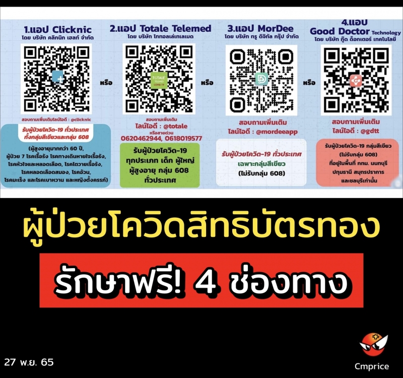 3.แอป GoodDoctor Technology รับเฉพาะผู้ป่วยโควิด-19 กลุ่มสีเขียว (ไม่รับกลุ่ม 608) ที่อยู่ในพื้นที่ กทม. นนทบุรี ปทุมธานี สมุทรปราการ และชลบุรี เท่านั้น ลงทะเบียนที่ https://forms.gle/YKVMKy1p8FRDDBje7 สอบถามเพิ่มเติม ไลน์ไอดี : @gdtt