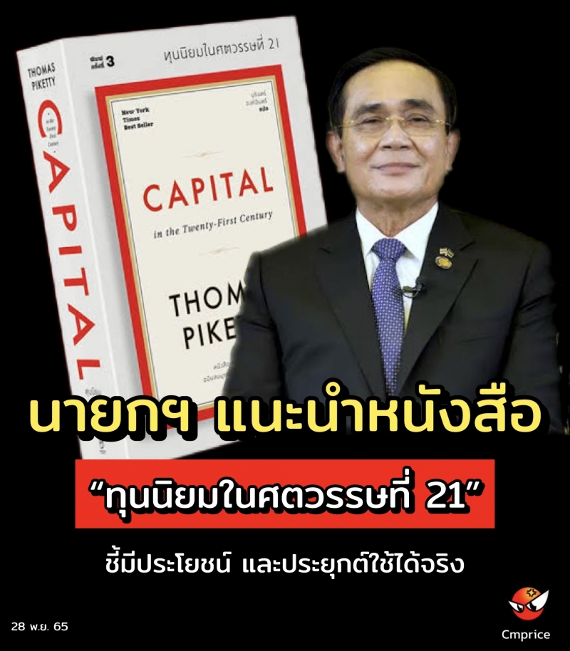 วันนี้ (28 พฤศจิกายน 2565) นายอนุชา บูรพชัยศรี รองเลขาธิการนายกรัฐมนตรีฝ่ายการเมือง ปฏิบัติหน้าที่โฆษกประจำสำนักนายกรัฐมนตรี เปิดเผยว่า พลเอก ประยุทธ์ จันทร์โอชา นายกรัฐมนตรีและรัฐมนตรีว่าการกระทรวงกลาโหม แนะนำหนังสือ”ทุนนิยมในศตวรรษที่ 21 : Capital in the Twenty – First Century” เขียนโดย Thomas Piketty (โทมัส พิเก็ตตี) นักเศรษฐศาสตร์ชาวฝรั่งเศส