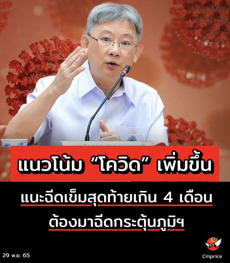 | • สธ. เผย แนวโน้ม โควิด เพิ่มขึ้น แนะฉีดเข็มสุดท้ายเกิน 4 เดือน ต้องมาฉีดกระตุ้นภูมิฯ |